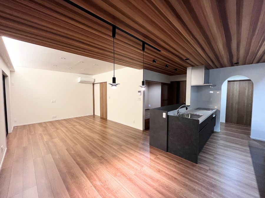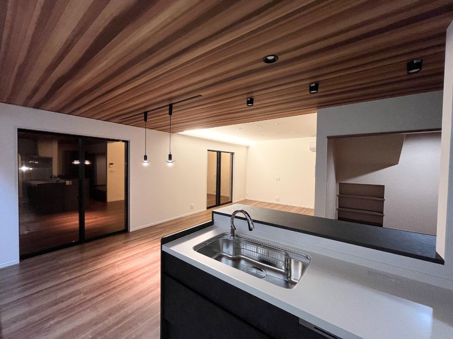 掃き出し窓上部の間接照明が空間をやさしく照らし、ダイニングの高演色LEDペンダントライトが食卓を鮮やかに彩ります。 -