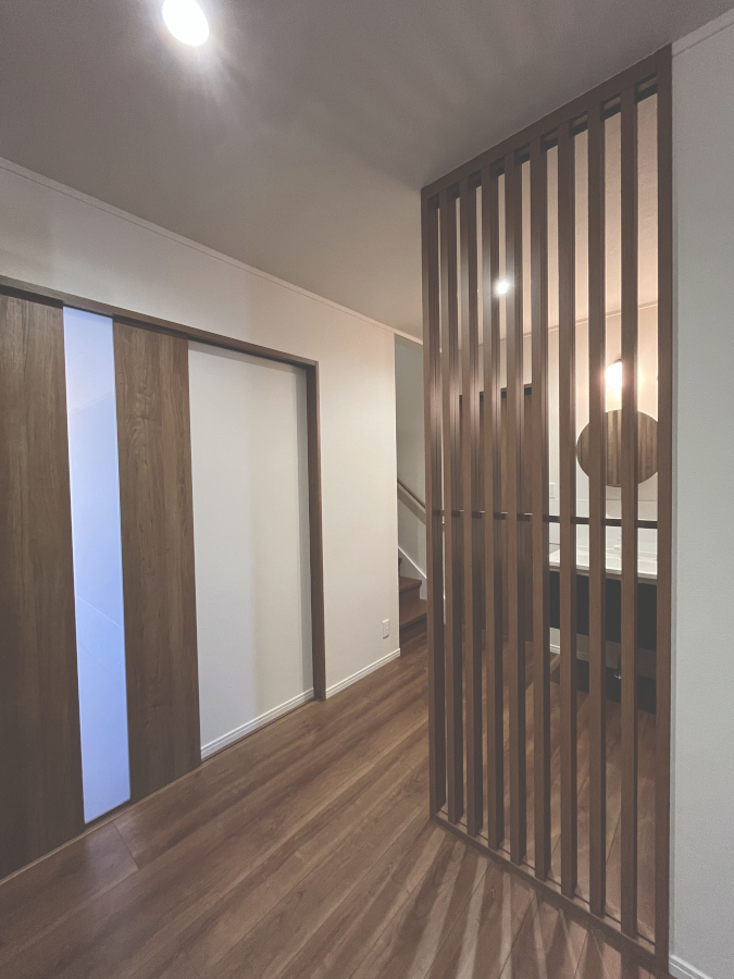 目隠しとしてスリット格子を配し、玄関と洗面スペースをやわらかく仕切っています。