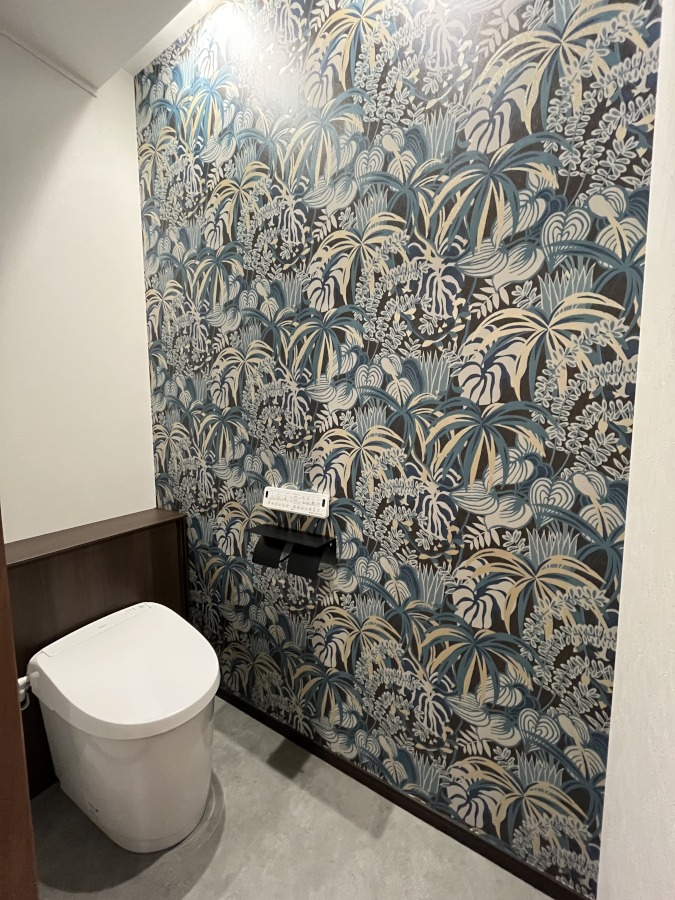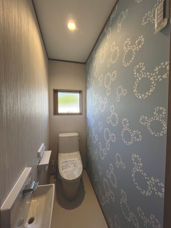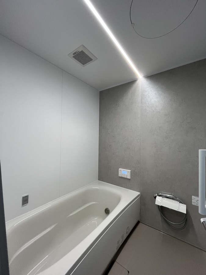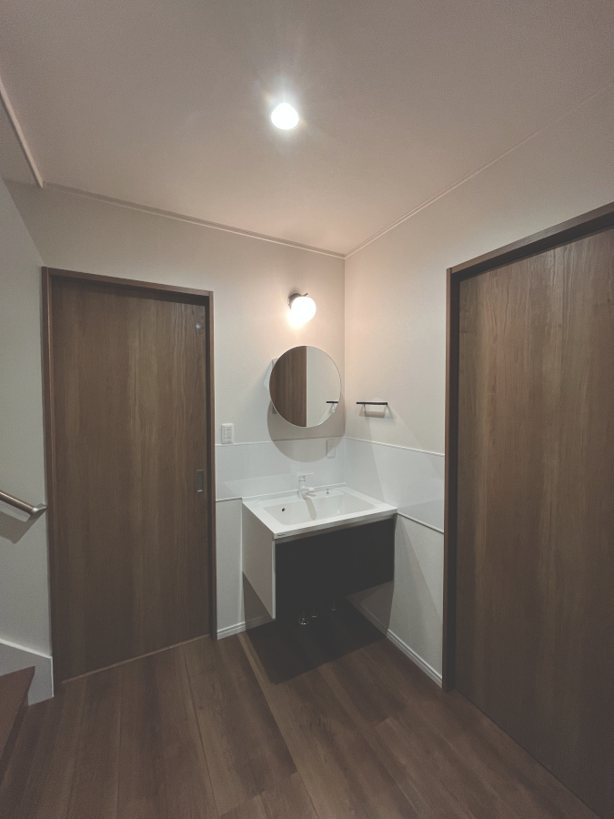 鏡はお施主様支給品の丸型収納タイプ。こだわりのアイテムが引き立つような空間デザインです。 -